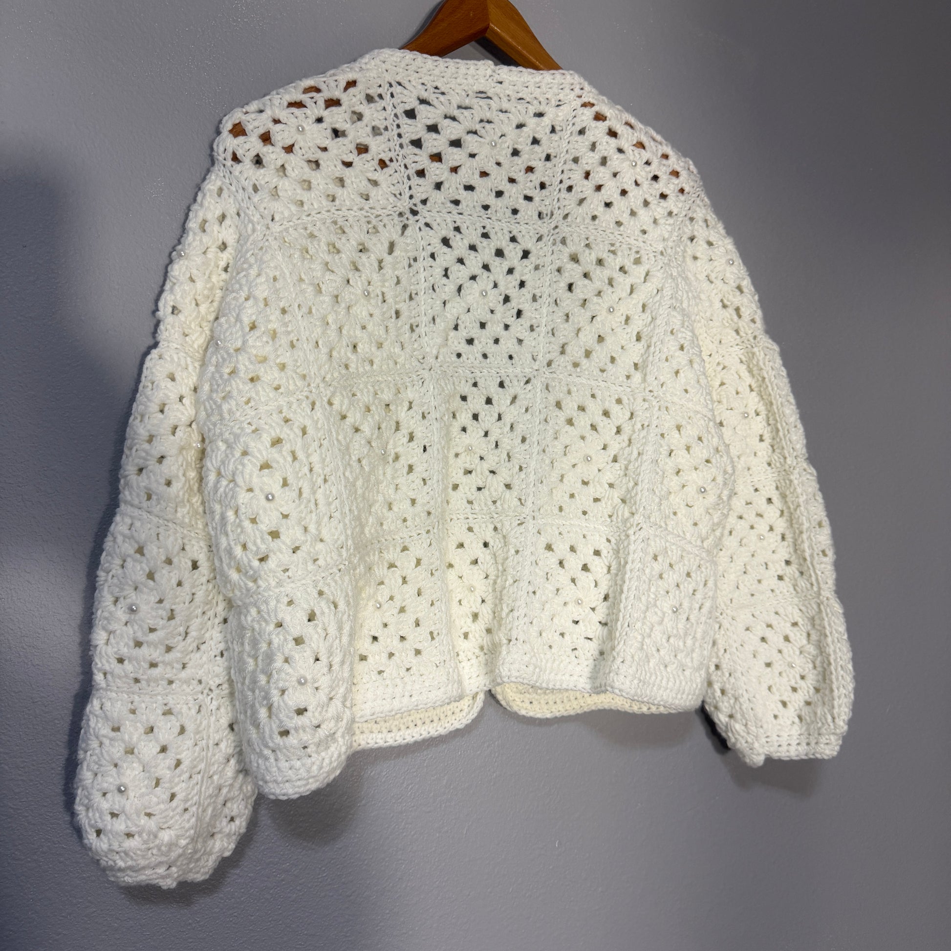 Handmade White Crochet Granny Square Jacket Pearls Cozy Elegant Cardigan Size L