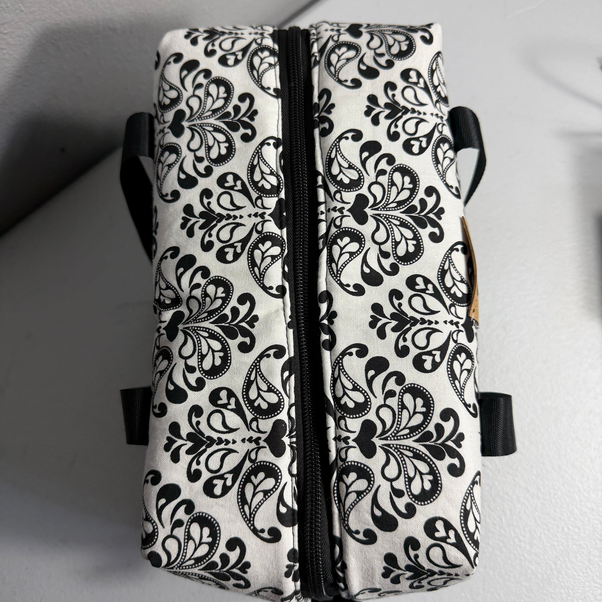 Carry your meals in style with the Fe.ly Luxe Insulated Lunch Bag, a handcrafted piece that blends elegance and practicality. Designed with premium cotton fabric, this bag features a sophisticated black and white damask pattern paired with a modern polka-dot contrast, giving it a timeless and fashionable look.