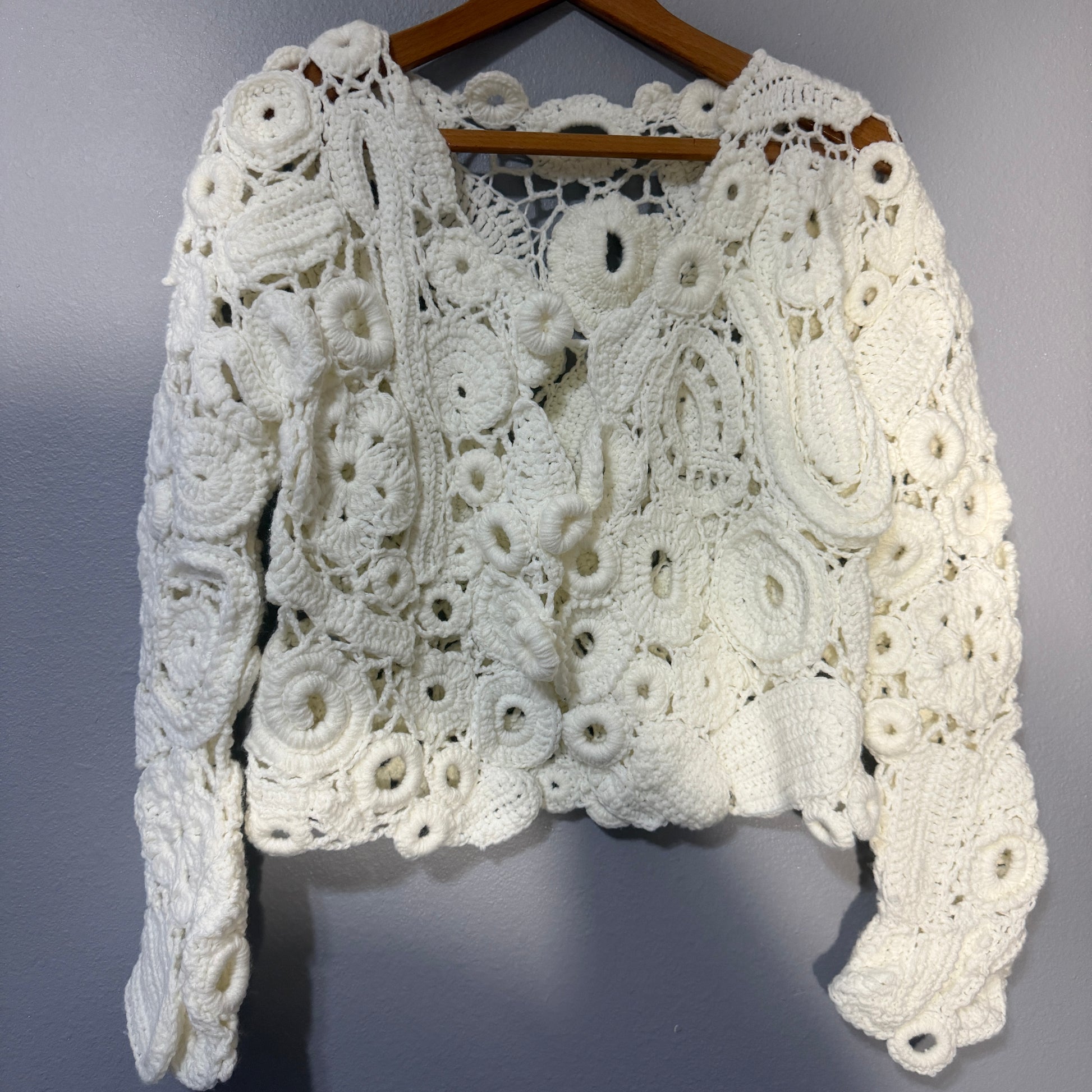 Luxury Crochet Jacket – Handmade Textured Statement Piece in White Size M Boho Bridal Sweater Jacket Unique
